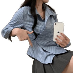 韩版设计不规则收腰秋季衬衣条纹学院风衬衫长袖新款显瘦上衣