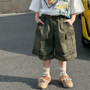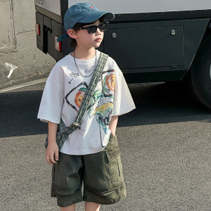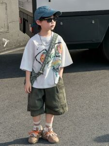男の子夏半袖スーツ子供夏韓国語版 2025 新しい漫画作業服 5 点パンツスポーツ子供服トレンド