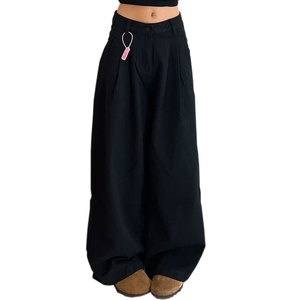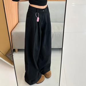 プリーツデザインの黒のワイドレッグデニムパンツ、太った女性用、大きいサイズ、ハイウエスト、ゆったりとした質感のフロアレングスパンツ