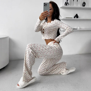 欧米の越境独立駅欧米の春夏のデザイン感は綿の小さい花のプリントの長袖のズボンの臍のスーツを含みます。