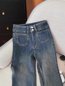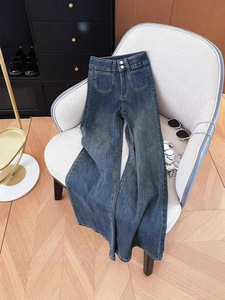 女性用レトロダークブルーフレアジーンズ、春夏ハイウエストストレートワイドレッグパンツ、スリム馬蹄フロアレングスパンツ