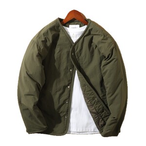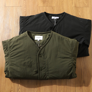 日系复古无领夹棉夹克棉衣男 暗格防风工装叠穿V领按扣棉服外套男