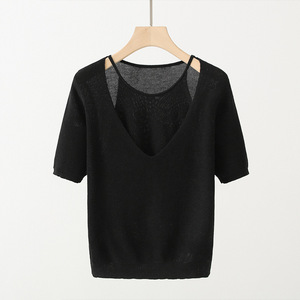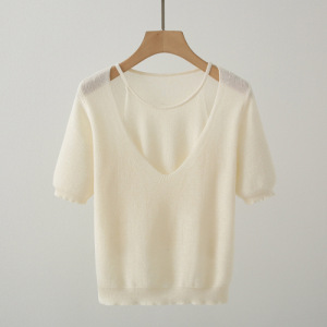 2025 新しい夏スタイル偽ツーピース気質年齢軽減甘い V ネックホルター半袖セーター女性のフレグランストップ