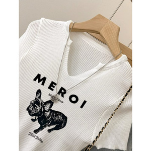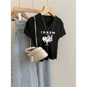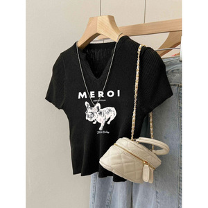 ダークグレーニット半袖レディース2025新作VネックショルダーTシャツニッチスリムフィットショートニットセータートップ
