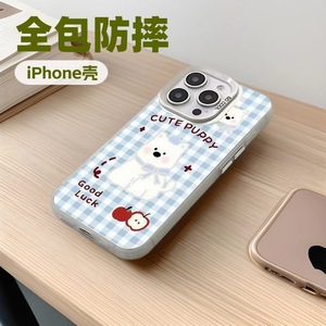 チェック柄の犬柄が可愛い、Apple 17 Pro Max用スマホケース。個性的で元気いっぱい。iPhone 16/15/14/13対応。欧米風。