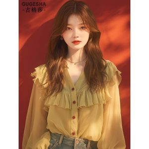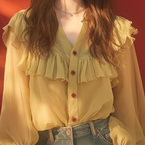 黄色のフリル付きVネックシャツ レディース 秋の流行 ユニークなニッチデザイントップス エレガントなシフォンシャツ