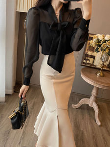 法式套装裙女2025早秋新款黑色长袖衬衫高腰包臀鱼尾半身裙两件套
