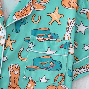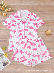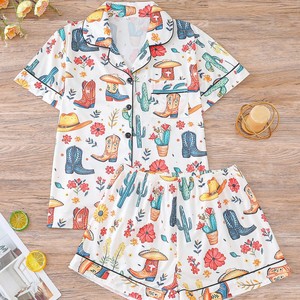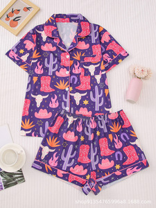 国境を越えた貿易人気のパジャマ四季デニムブーツプリントラペル半袖ショーツレディースホームウェアセット