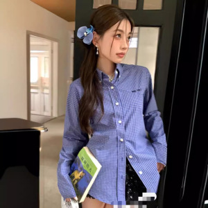 南油高货原标SS25早秋新款MIU家学院风字母刺绣格纹衬衫蓝色衬衣