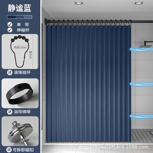 静かなブルーの厚い生地: (シングルカーテン + 伸縮ロッド + フック + ストラップ)