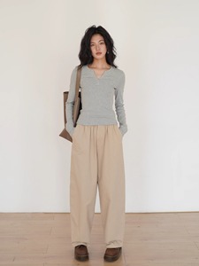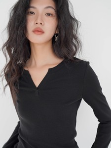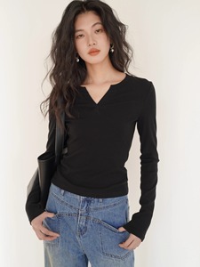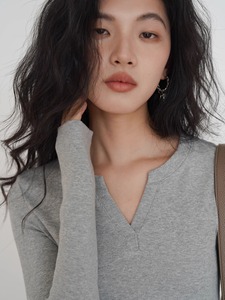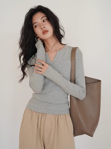 2517# EM八月 灰色v领针织打底衫上衣2025年新款纯色内搭长袖t恤