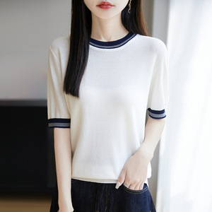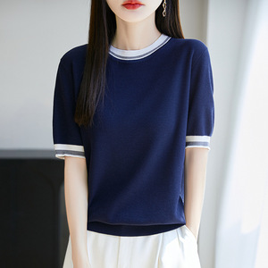 マルベリーシルクテンセルラウンドネックセーター七分袖レディース2025夏新作カラーブロックルーズプルオーバーボトリングシャツ