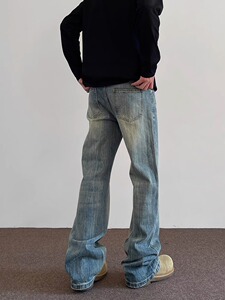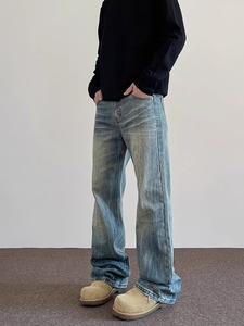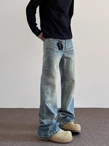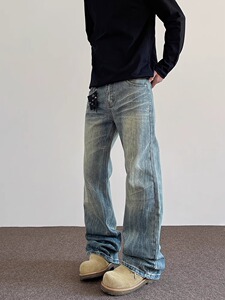 猫须竹节纹水洗牛仔裤男直筒宽松美式复古裤子潮牌痞帅显高微喇裤
