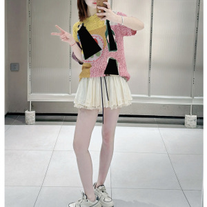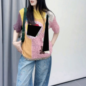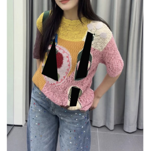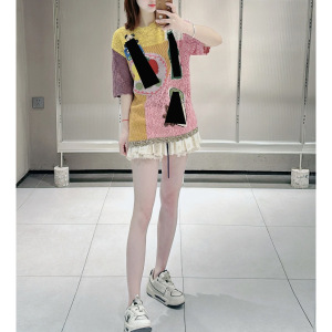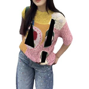 現物の女の子系の女性服の夏の手のフックの手は漫画の食品の図案の丸首のニットの半袖の上着を刺繍します。