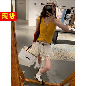 Le rouge周美美vネック単列ボタン黄色ねじニット不規則裾重ね着ベスト上着