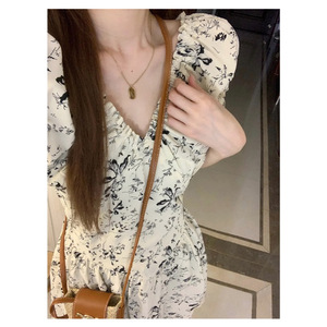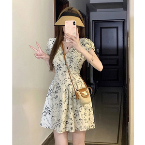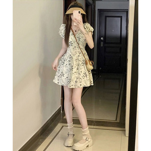 フレンチ V ネック花柄ドレス女性のための夏 2025 新しいウエスト痩身気質甘い小柄な A ラインスカート