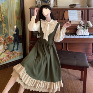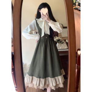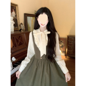 绿色背带连衣裙秋冬法式长裙气质轻学院风系带半高领衬衫两件套