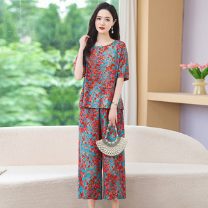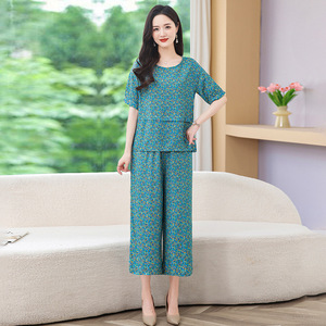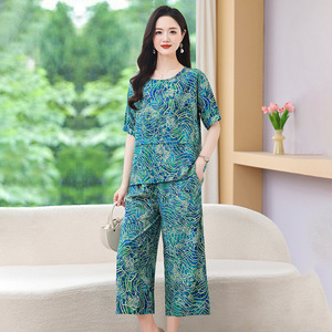 コットンシルクスーツレディース夏服ファッショナブルな新しいプリント半袖トップスとクロップドパンツコットン厚手ツーピースカジュアルルーズアウターウェア