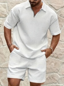 メンズスーツ夏の貿易新しいトレンディなカジュアルファッションワッフル快適な無地ラペルシャツスポーツスーツ