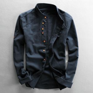 Amazonクロスボーダーヨーロッパとアメリカの春と秋の新しいメンズ中国風長袖ボタンスタンドカラーシャツ無地カジュアルシャツ