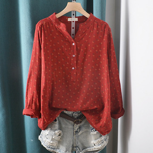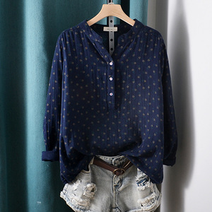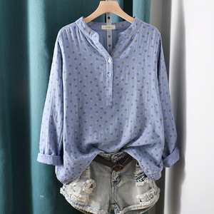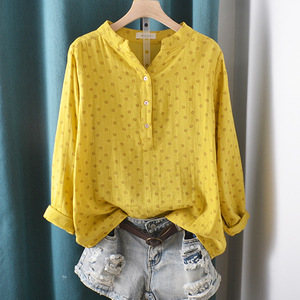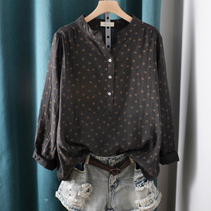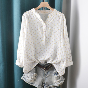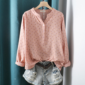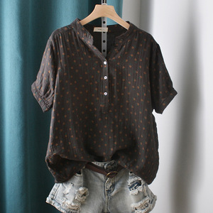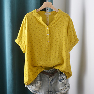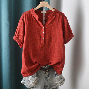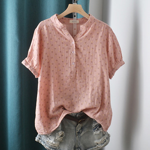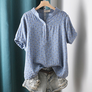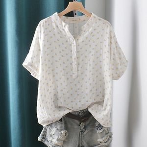 韓国版の二層綿ガーゼプリントハーフオープンVネック半袖シャツ女性用夏の新しいカジュアルルーズトップシャツ女性用