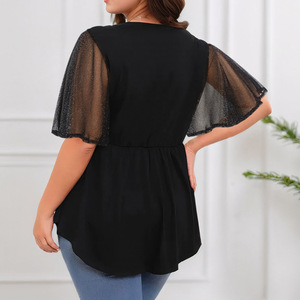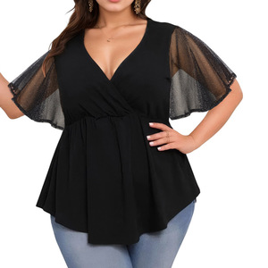 2025 ヨーロッパとアメリカのアマゾン大きいサイズ無地 V ネックシルバーメッシュフライングスリーブ不規則な裾カジュアルトップ夏