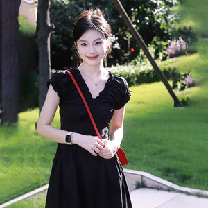 フランスvネックの黒いワンピースの子供は夏2025年の新型の高級感があります。
