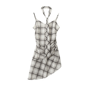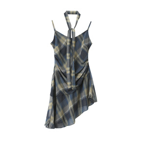 【欧凡】甘辛い風の不規則なvネックの格子のサスペンダーのスカートの夏の背中の袖なしのしわのワンピース2911