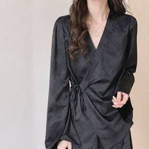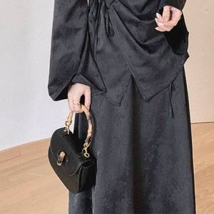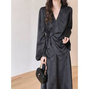 新しい中国風デザイン中国風サテンツーピースロングスカート女性のための 2025 春痩身長袖黒ドレス女性のための