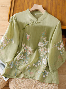 文学的な春夏の新しいスタイルのスタンドカラー半袖Tシャツ、女性用、エレガントな七分袖ボタン刺繍コットンとリネントップ