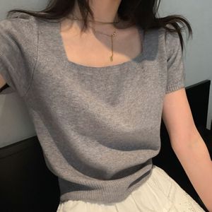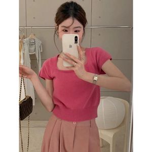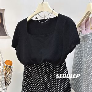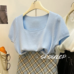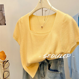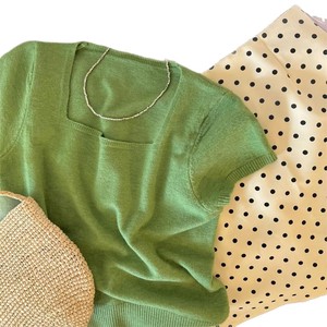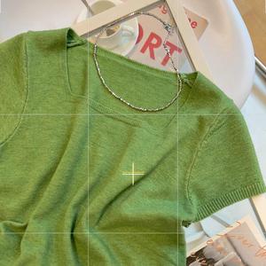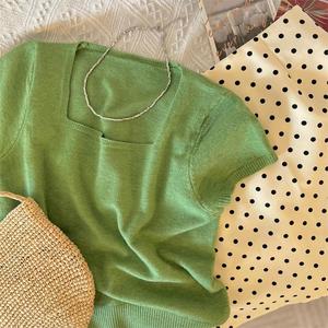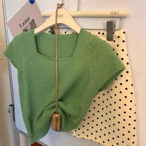 グリーンスクエアネックショルダー半袖Tシャツレディース2025年夏新作ショートスタイルウエストニッチデザイントップ