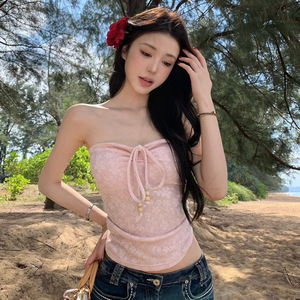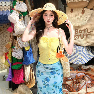 多巴胺欲辣妹黄色抹胸绑带上衣女夏季海边度假风拍照穿搭氛围感