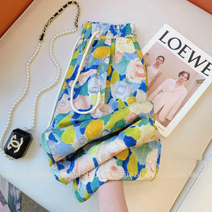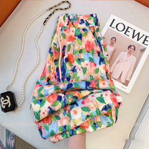 2025年新作夏フラワーパンツレディースカジュアルパンツ万能アイスシルクパンツゆったり着痩せワイドパンツシェイクパンツ9点パンツ