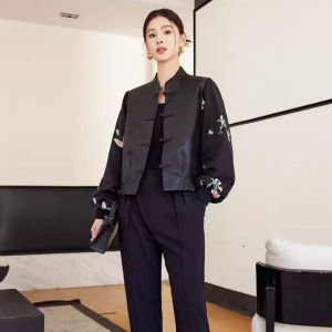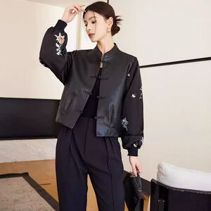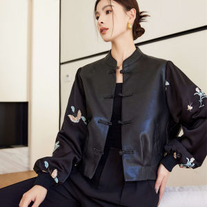 新しい中国式の本物の皮の服のコートの女性の春秋国の潮の短い金の中国風のデザインの気質の復古はやせている皮の服の809を現します。
