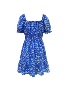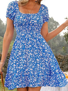 ワンピース欧米クロスボーダー春夏カジュアル半袖花柄ワンピーススクエアネックウエストプリントワンピース