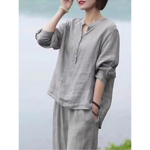グレーのコットンとリネンのスーツの女性の半袖カジュアルリネンシャツルーズ大きいサイズハイウエストストレートワイドレッグパンツ2点セット
