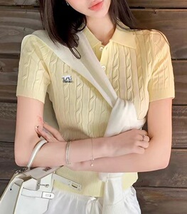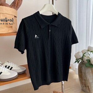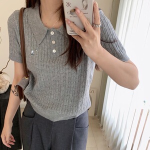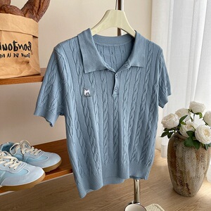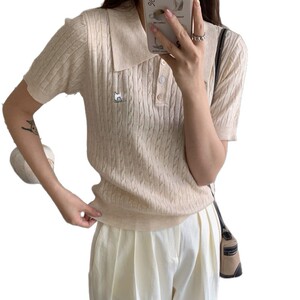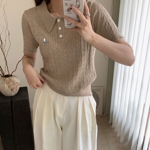夏の新しい無地ウールニット半袖Tシャツトップスツイスト手作り子犬刺繍デザインと多用途な気質