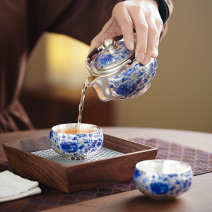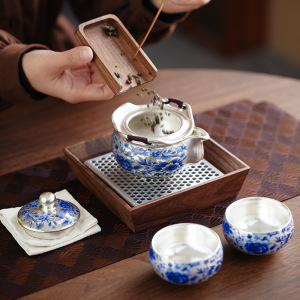文化的で創造的な銀メッキの青と白のポットとカップ 2 個のセラミック手ポットバッグ銀カンフー茶セットハイエンドビジネスギフト