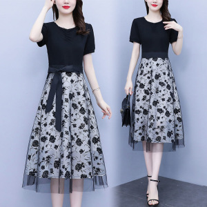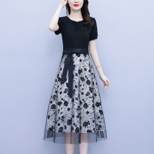 在庫あり半袖スプライシング偽ツーピースメッシュドレス女性のための夏の2025新しい気質ウエストストラップドレス