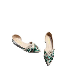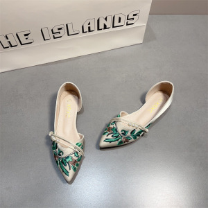 新しい中国風の尖った刺繍平底漢服靴春の新しいサイド空ビーニーシューズチャイナドレスソフトソールシングルシューズ