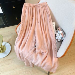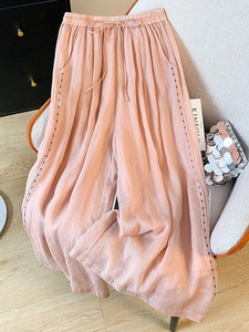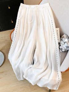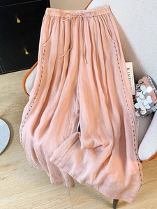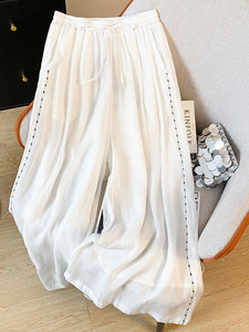 春夏新作女性用コットンリネンワイドレッグパンツ、ウエストゴム、ゆったり、大きいサイズ、肉感カバー、ドレープ感のある9点ワイドレッグカジュアルパンツ