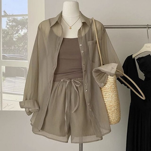 薄手の日焼け止めシャツトップス+スリムキャミソール+ゆったり万能ショーツレディーススリーピーススーツ