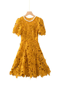 フランス式2025春夏新作女装丸首半袖水溶花透かし彫りウエストミディアムロング気質ワンピース