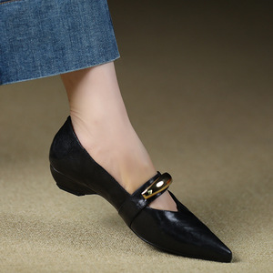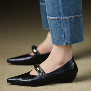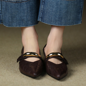 新しい英国ポインテッドトゥローヒールメリージェーンシューズ女性浅い口シングルシューズ女性フラットヒール小さな革靴女性