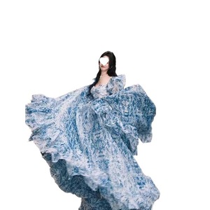 逃亡王女ドレス女性の夏フレンチスタイルパフスリーブライト高級ニッチドレスブルー花柄トレインスカート