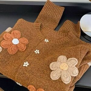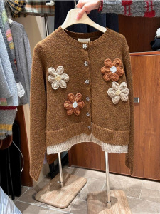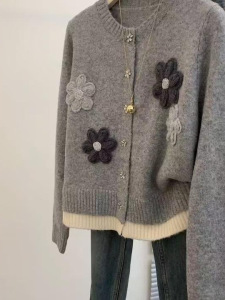 2025 秋冬新グレーフラワーフェイクツーピースショートセータージャケット女性のための柔らかくワックスのようなニットカーディガン