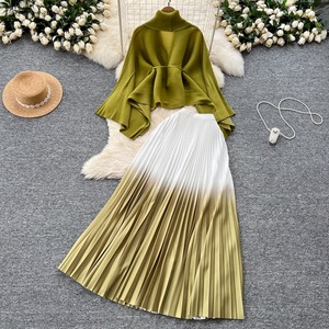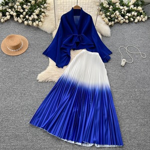 欧美时尚渐变色套装女秋冬宽松绑带收腰压褶上衣+高腰百褶半身裙