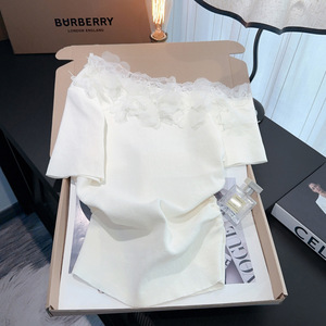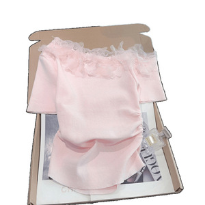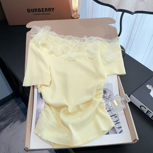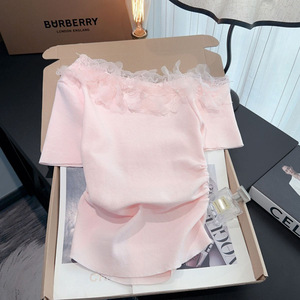 ファッションニッチデザイン 2025 女性の斜め肩レース半袖セーター女性の夏フレンチシックなスリムトップ