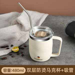 480ml オフホワイト二重層火傷防止マグ + ステンレススチールストロー