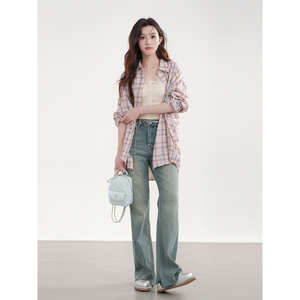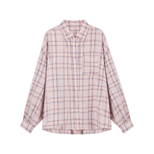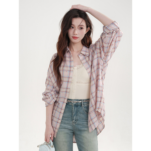 クロスボーダーピンクチェック柄レディースシャツ婦人服秋人気ブラウス女性秋薄手カーディガン薄手女性用日焼け止め服